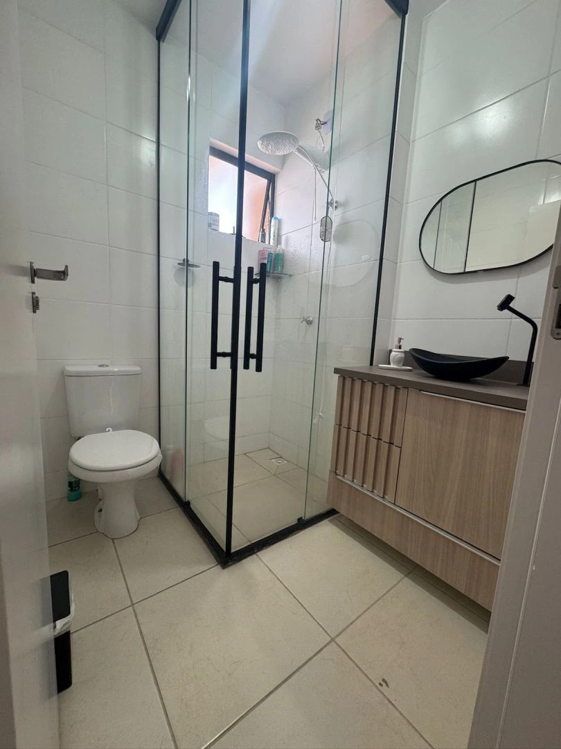 • Banheiro social moderno com box em vidro e metais de qualidade;