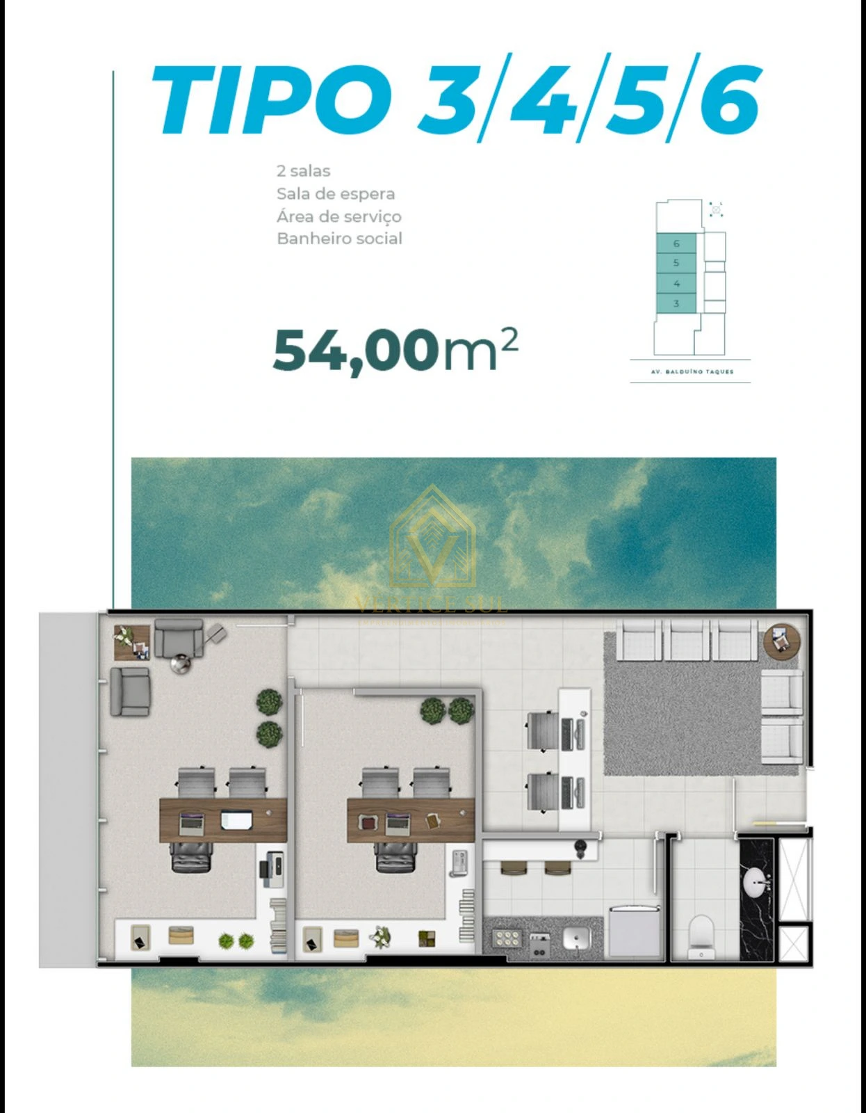 • 07 opções de plantas para salas comerciais;